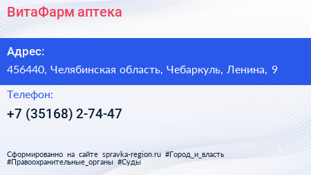 ВитаФарм, аптека по адресу 456440, Челябинская область, Чебаркуль, Ленина, 9 в дальнейшем Организация, размещена в следующих категориях:
