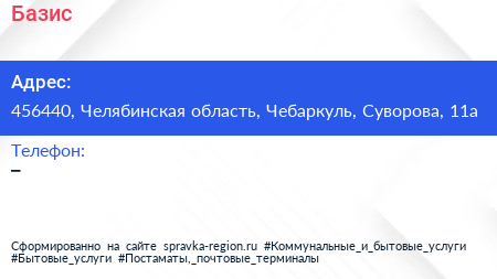 Базис по адресу 456440, Челябинская область, Чебаркуль, Суворова, 11а в дальнейшем Организация, размещена в следующих категориях: