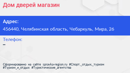Дом дверей, магазин по адресу 456440, Челябинская область, Чебаркуль, Мира, 26 в дальнейшем Организация, размещена в следующих категориях: