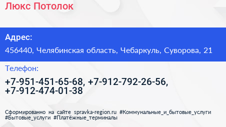Люкс Потолок по адресу 456440, Челябинская область, Чебаркуль, Суворова, 21 в дальнейшем Организация, размещена в следующих категориях: