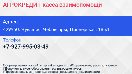 АГРОКРЕДИТ, касса взаимопомощи по адресу 429950, Чувашия, Чебоксары, Пионерская, 18 к1 в дальнейшем Организация, размещена в следующих категориях: