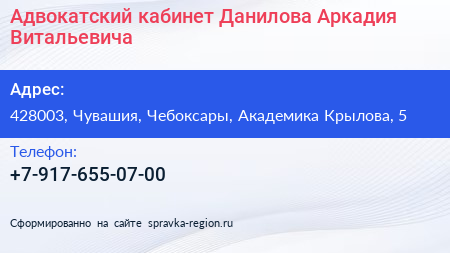 Адвокатский кабинет Данилова Аркадия Витальевича по адресу 428003, Чувашия, Чебоксары, Академика Крылова, 5 в дальнейшем Организация, размещена в следующих категориях: