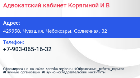 Адвокатский кабинет Корягиной И.В. по адресу 429958, Чувашия, Чебоксары, Солнечная, 32 в дальнейшем Организация, размещена в следующих категориях: