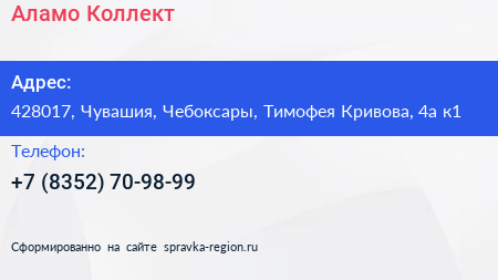 Аламо Коллект по адресу 428017, Чувашия, Чебоксары, Тимофея Кривова, 4а к1 в дальнейшем Организация, размещена в следующих категориях: