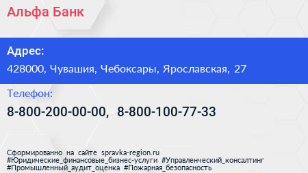 Альфа-Банк по адресу 428000, Чувашия, Чебоксары, Ярославская, 27 в дальнейшем Организация, размещена в следующих категориях: