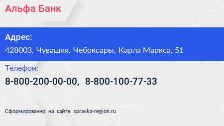 Альфа-Банк по адресу 428003, Чувашия, Чебоксары, Карла Маркса, 51 в дальнейшем Организация, размещена в следующих категориях: