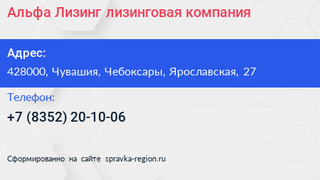 Альфа-Лизинг, лизинговая компания по адресу 428000, Чувашия, Чебоксары, Ярославская, 27 в дальнейшем Организация, размещена в следующих категориях: