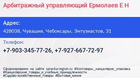 Арбитражный управляющий Ермолаев Е.Н. по адресу 428038, Чувашия, Чебоксары, Энтузиастов, 31 в дальнейшем Организация, размещена в следующих категориях: