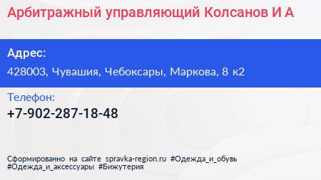 Арбитражный управляющий Колсанов И.А. по адресу 428003, Чувашия, Чебоксары, Маркова, 8 к2 в дальнейшем Организация, размещена в следующих категориях: