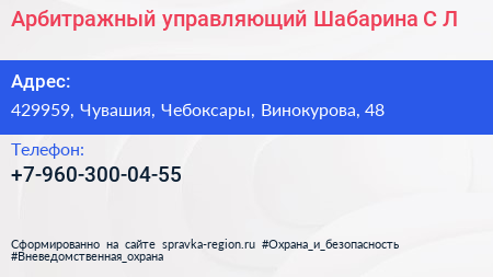 Арбитражный управляющий Шабарина С.Л. по адресу 429959, Чувашия, Чебоксары, Винокурова, 48 в дальнейшем Организация, размещена в следующих категориях: