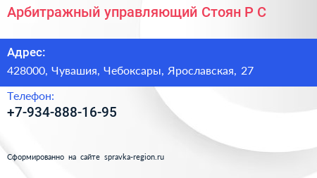 Арбитражный управляющий Стоян Р.С. по адресу 428000, Чувашия, Чебоксары, Ярославская, 27 в дальнейшем Организация, размещена в следующих категориях:
