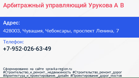 Арбитражный управляющий Урукова А.В. по адресу 428003, Чувашия, Чебоксары, проспект Ленина, 7 в дальнейшем Организация, размещена в следующих категориях:
