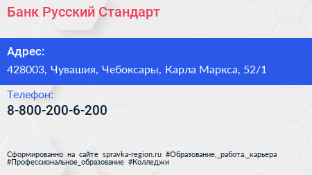 Банк Русский Стандарт по адресу 428003, Чувашия, Чебоксары, Карла Маркса, 52/1 в дальнейшем Организация, размещена в следующих категориях: