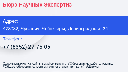 Бюро Научных Экспертиз по адресу 428032, Чувашия, Чебоксары, Ленинградская, 24 в дальнейшем Организация, размещена в следующих категориях: