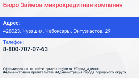 Бюро Займов, микрокредитная компания по адресу 428023, Чувашия, Чебоксары, Энтузиастов, 29 в дальнейшем Организация, размещена в следующих категориях: