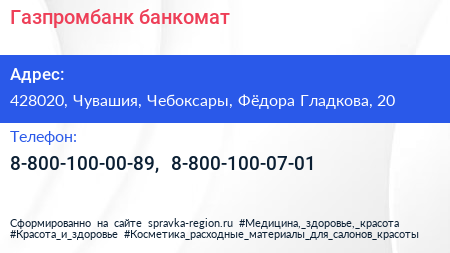 Газпромбанк, банкомат по адресу 428020, Чувашия, Чебоксары, Фёдора Гладкова, 20 в дальнейшем Организация, размещена в следующих категориях: