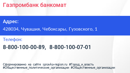 Газпромбанк, банкомат по адресу 428034, Чувашия, Чебоксары, Гузовского, 1 в дальнейшем Организация, размещена в следующих категориях: