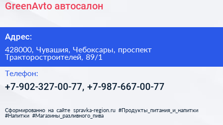 GreenAvto, автосалон по адресу 428000, Чувашия, Чебоксары, проспект Тракторостроителей, 89/1 в дальнейшем Организация, размещена в следующих категориях: