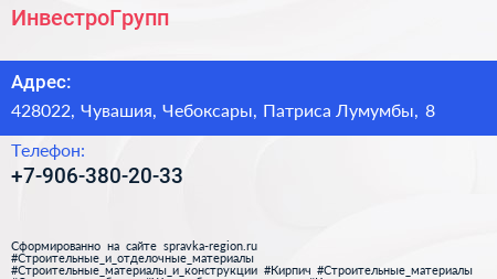 ИнвестроГрупп по адресу 428022, Чувашия, Чебоксары, Патриса Лумумбы, 8 в дальнейшем Организация, размещена в следующих категориях: