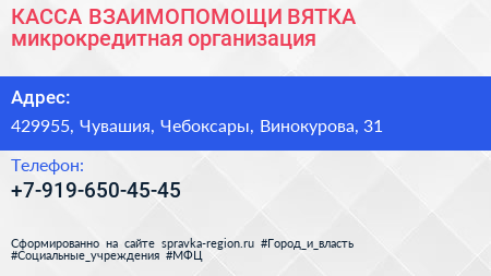 КАССА ВЗАИМОПОМОЩИ ВЯТКА, микрокредитная организация по адресу 429955, Чувашия, Чебоксары, Винокурова, 31 в дальнейшем Организация, размещена в следующих категориях: