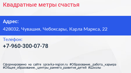 Квадратные метры счастья по адресу 428032, Чувашия, Чебоксары, Карла Маркса, 22 в дальнейшем Организация, размещена в следующих категориях: