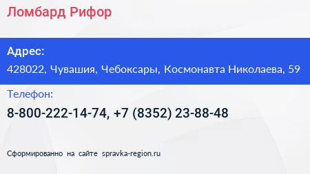 Ломбард Рифор по адресу 428022, Чувашия, Чебоксары, Космонавта Николаева, 59 в дальнейшем Организация, размещена в следующих категориях: