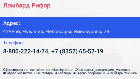Ломбард Рифор по адресу 429956, Чувашия, Чебоксары, Винокурова, 78 в дальнейшем Организация, размещена в следующих категориях: