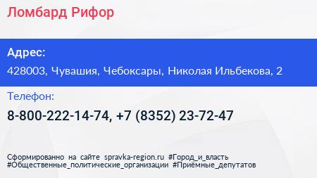 Ломбард Рифор по адресу 428003, Чувашия, Чебоксары, Николая Ильбекова, 2 в дальнейшем Организация, размещена в следующих категориях: