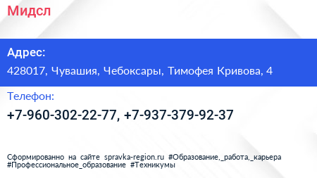Мидсл по адресу 428017, Чувашия, Чебоксары, Тимофея Кривова, 4 в дальнейшем Организация, размещена в следующих категориях: