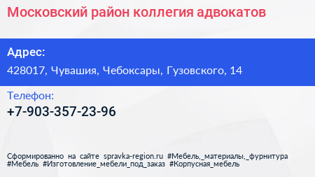 Московский район, коллегия адвокатов по адресу 428017, Чувашия, Чебоксары, Гузовского, 14 в дальнейшем Организация, размещена в следующих категориях: