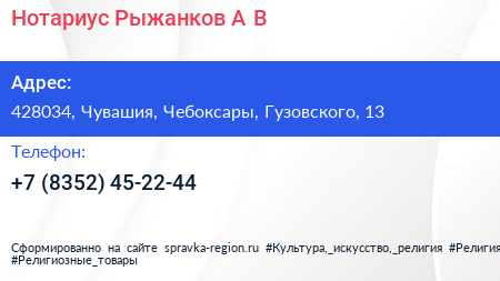 Нотариус Рыжанков А.В. по адресу 428034, Чувашия, Чебоксары, Гузовского, 13 в дальнейшем Организация, размещена в следующих категориях: