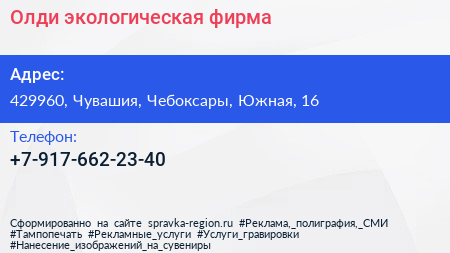 Олди, экологическая фирма по адресу 429960, Чувашия, Чебоксары, Южная, 16 в дальнейшем Организация, размещена в следующих категориях: