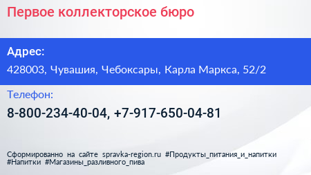 Первое коллекторское бюро по адресу 428003, Чувашия, Чебоксары, Карла Маркса, 52/2 в дальнейшем Организация, размещена в следующих категориях: