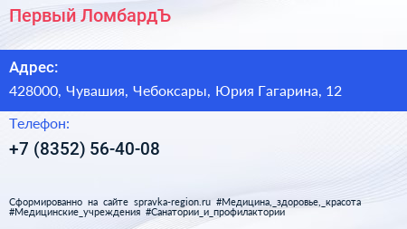 Первый ЛомбардЪ по адресу 428000, Чувашия, Чебоксары, Юрия Гагарина, 12 в дальнейшем Организация, размещена в следующих категориях: