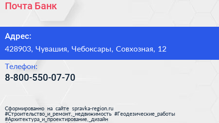 Почта Банк по адресу 428903, Чувашия, Чебоксары, Совхозная, 12 в дальнейшем Организация, размещена в следующих категориях:
