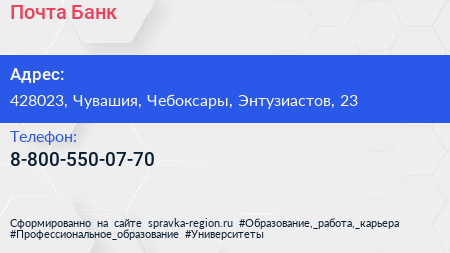 Почта Банк по адресу 428023, Чувашия, Чебоксары, Энтузиастов, 23 в дальнейшем Организация, размещена в следующих категориях: