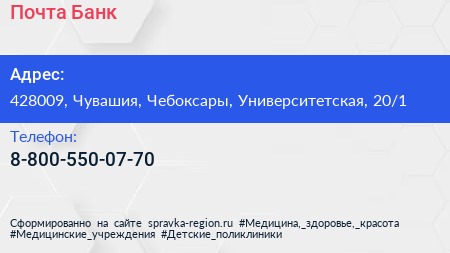 Почта Банк по адресу 428009, Чувашия, Чебоксары, Университетская, 20/1 в дальнейшем Организация, размещена в следующих категориях:
