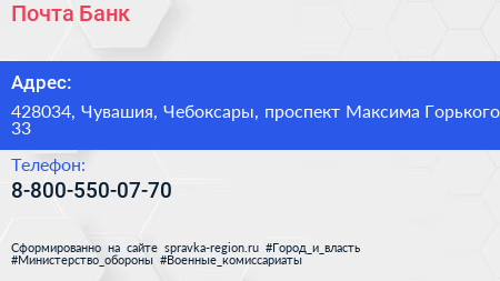 Почта Банк по адресу 428034, Чувашия, Чебоксары, проспект Максима Горького, 33 в дальнейшем Организация, размещена в следующих категориях: