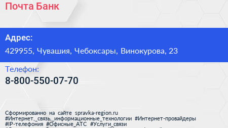 Почта Банк по адресу 429955, Чувашия, Чебоксары, Винокурова, 23 в дальнейшем Организация, размещена в следующих категориях: