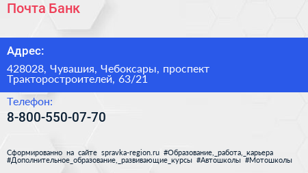 Почта Банк по адресу 428028, Чувашия, Чебоксары, проспект Тракторостроителей, 63/21 в дальнейшем Организация, размещена в следующих категориях:
