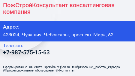 ПожСтройКонсультант, консалтинговая компания по адресу 428024, Чувашия, Чебоксары, проспект Мира, 62г в дальнейшем Организация, размещена в следующих категориях: