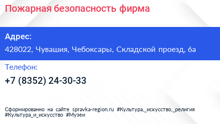 Пожарная безопасность, фирма по адресу 428022, Чувашия, Чебоксары, Складской проезд, 6а в дальнейшем Организация, размещена в следующих категориях: