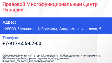 Правовой Многофункциональный Центр Чувашии по адресу 428003, Чувашия, Чебоксары, Академика Крылова, 5 в дальнейшем Организация, размещена в следующих категориях: