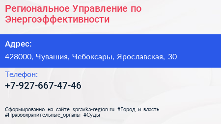 Региональное Управление по Энергоэффективности по адресу 428000, Чувашия, Чебоксары, Ярославская, 30 в дальнейшем Организация, размещена в следующих категориях: