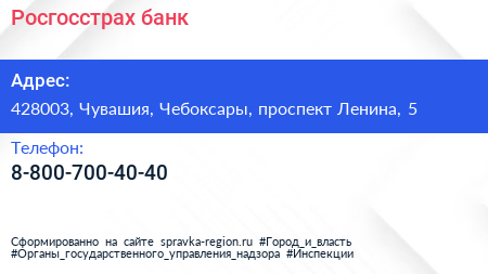 Росгосстрах банк по адресу 428003, Чувашия, Чебоксары, проспект Ленина, 5 в дальнейшем Организация, размещена в следующих категориях: