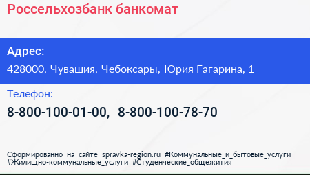 Россельхозбанк, банкомат по адресу 428000, Чувашия, Чебоксары, Юрия Гагарина, 1 в дальнейшем Организация, размещена в следующих категориях: