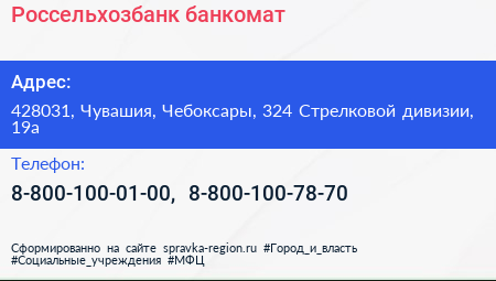 Россельхозбанк, банкомат по адресу 428031, Чувашия, Чебоксары, 324 Стрелковой дивизии, 19а в дальнейшем Организация, размещена в следующих категориях: