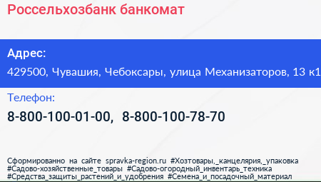 Россельхозбанк, банкомат по адресу 429500, Чувашия, Чебоксары, улица Механизаторов, 13 к1 в дальнейшем Организация, размещена в следующих категориях: