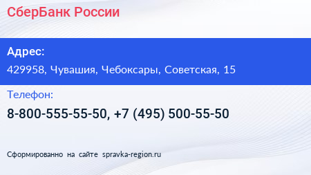 СберБанк России по адресу 429958, Чувашия, Чебоксары, Советская, 15 в дальнейшем Организация, размещена в следующих категориях: