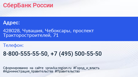 СберБанк России по адресу 428028, Чувашия, Чебоксары, проспект Тракторостроителей, 71 в дальнейшем Организация, размещена в следующих категориях: